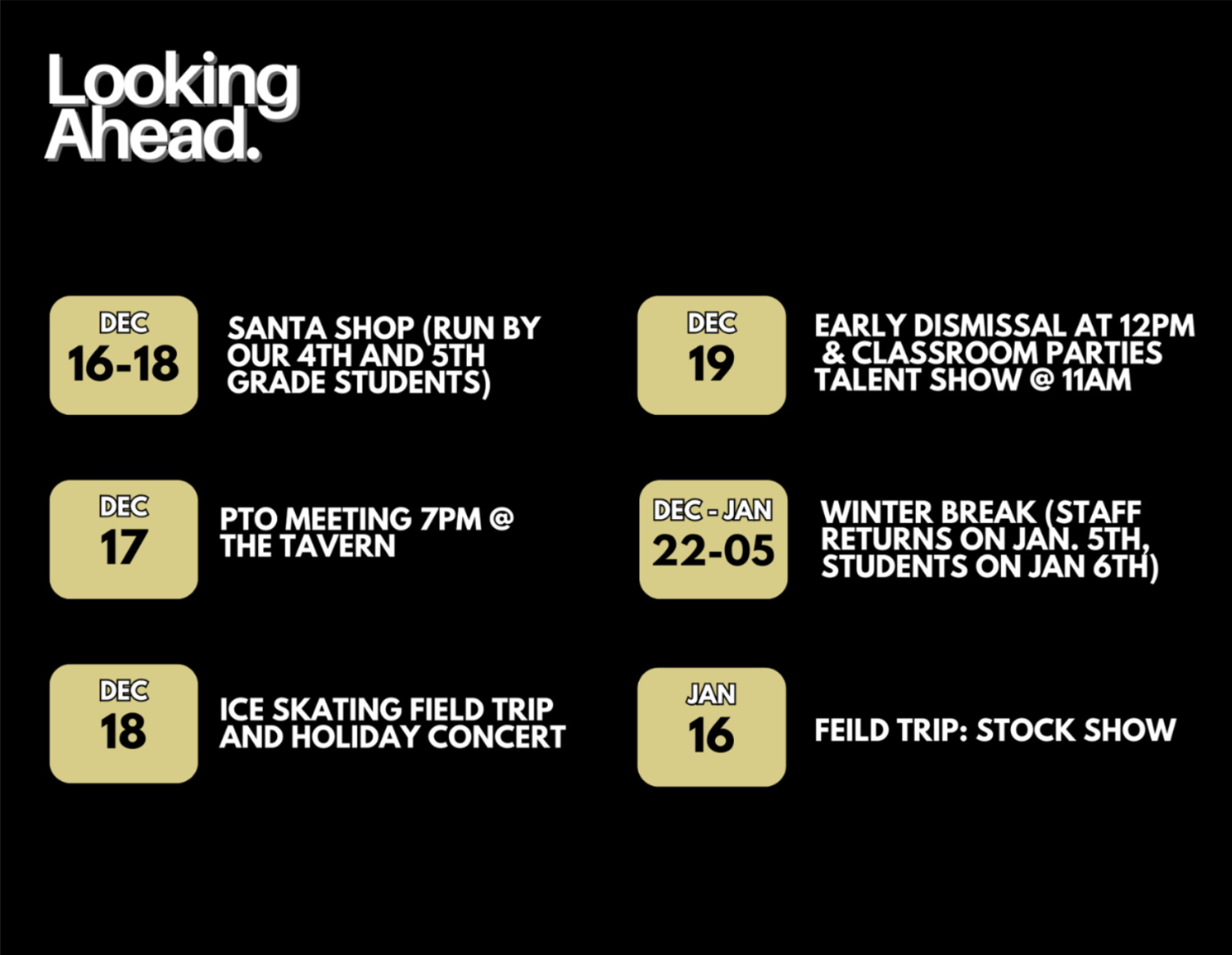 We are looking forward to our ice skating and holiday concert on Thursday, as well as classroom parties and the talent show on Friday. As a reminder Friday is an early release day so don’t forget to pick your child up at noon.